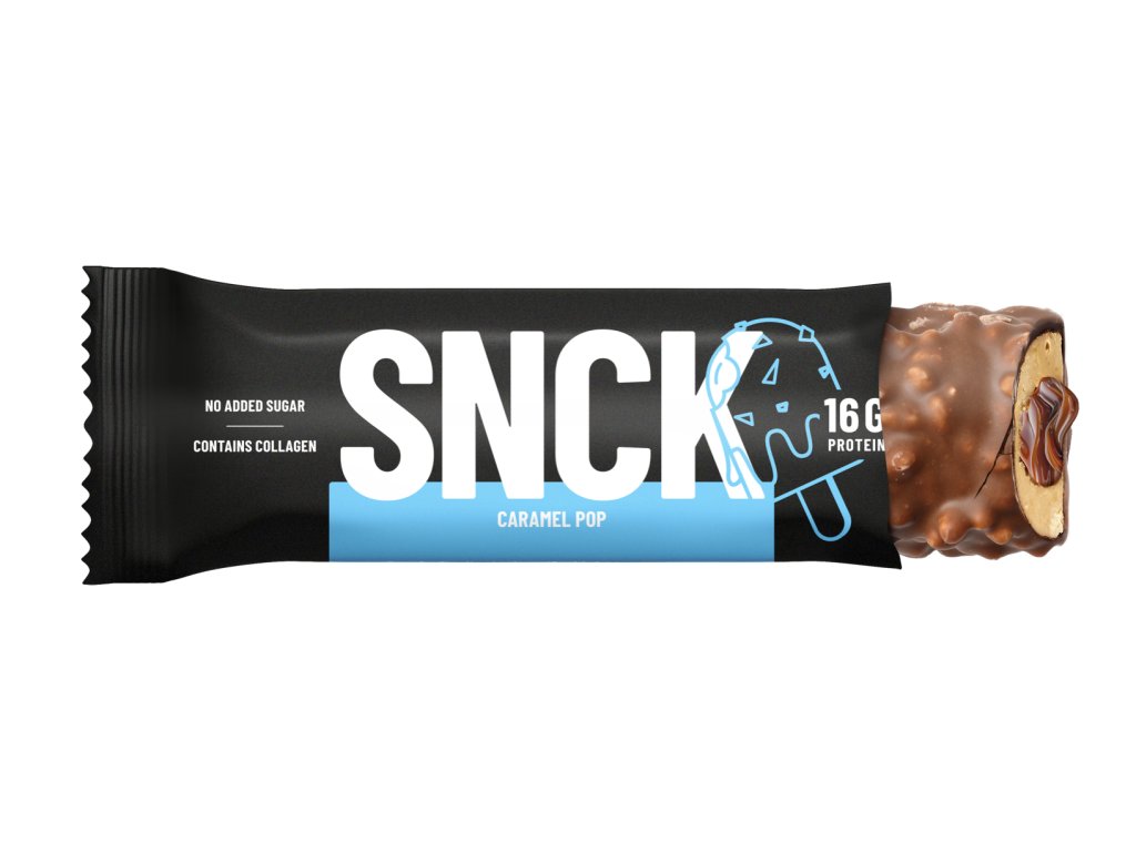 Popis produktu: SNCK (čti: snack) je lahodná proteinová tyčinka s jemnou karamelovou příchutí, mléčnou čokoládou, kousky lískových ořechů a obalená v křupavé čokoládě. Obsahuje kolagen a vysoký obsah bílkovin. Bez přidaného cukru, se sladidly. Textura je měkká, vláčná, krémová. Sladkost vyvážená. Chuť plná a přirozená – bez chemického dozvuku, který znáte z běžných proteinových tyčinek